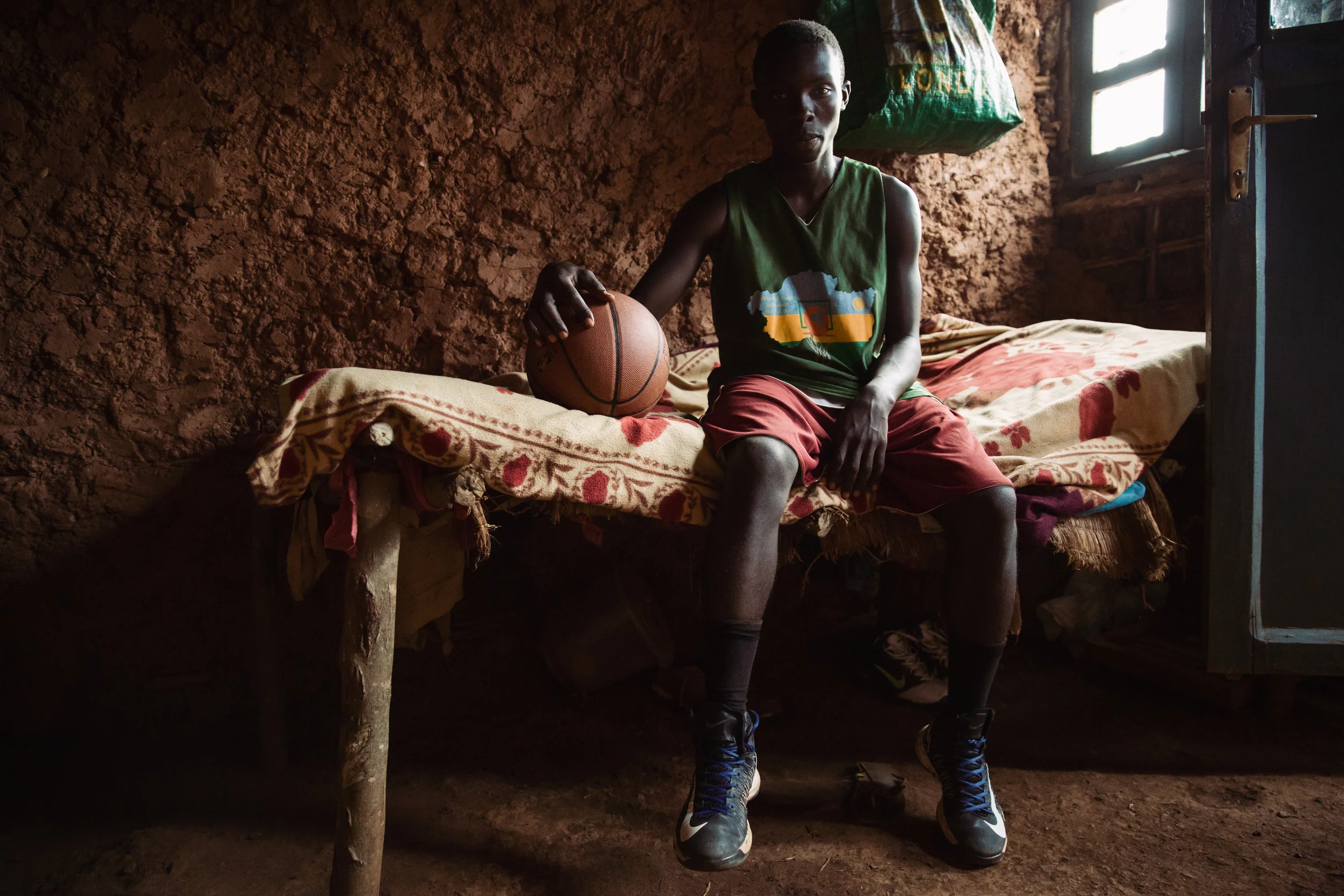 Erick Niyitanga, 18, in his bedroom in Nyamirama, Rwanda. Erick is a basketball coach and provider for his entire family of 5. He dropped out of school in order to work odd jobs, such as cleaning and construction every morning. Erick never misses a practice and goes to the court at least twice a day along with his brother and sisters. He credits basketball with teaching him about trust and how to be a man.