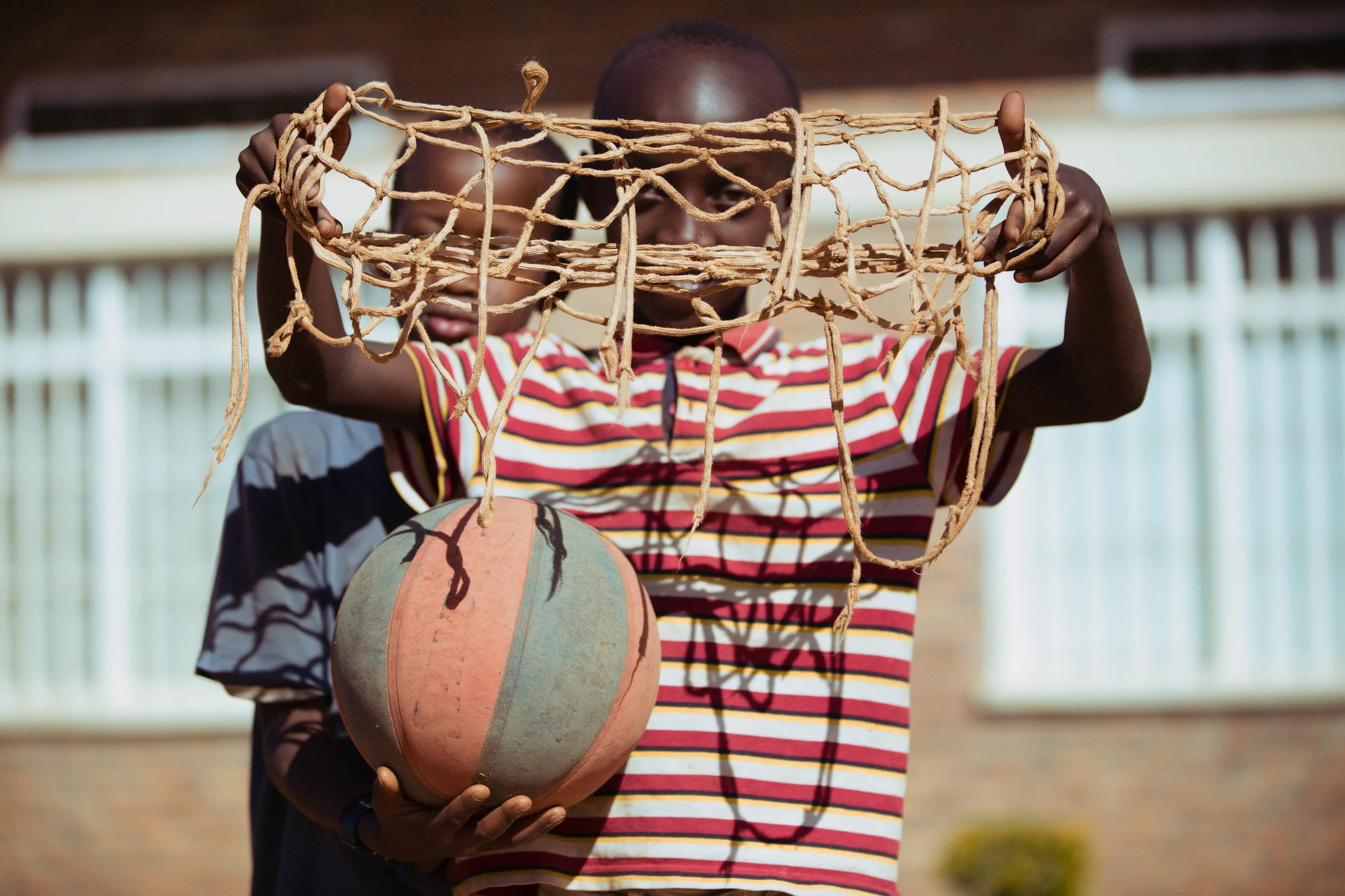 Isaac Turatsinze, 8, of Kayonza holds on to an old rim for repairs. The rims keep breaking off after dunks, as the backboards rot during the rainy season.