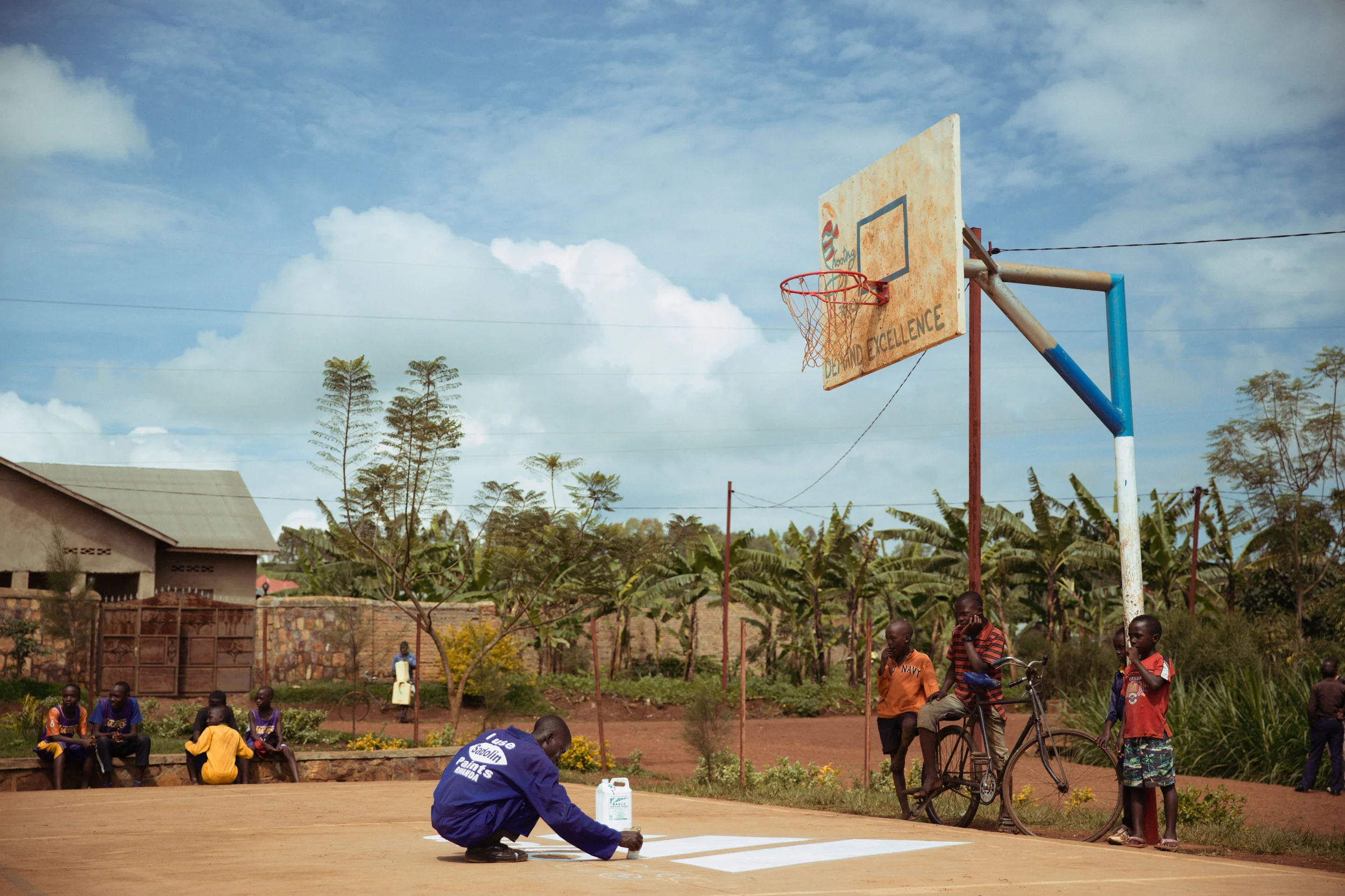 An artist paints the Adidas logo on a court in Kayonza, Rwanda following a sponsorship from employee Chris Rivers.