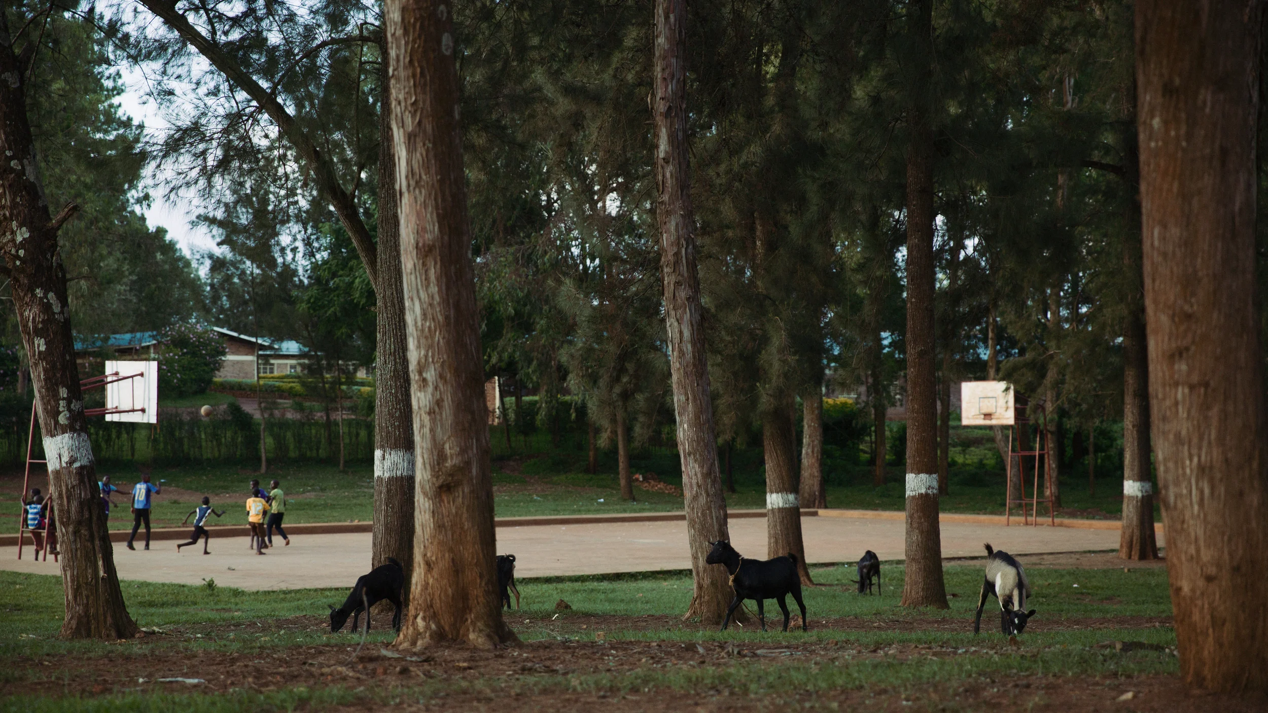 A court in Rukara, Rwanda. It's often a child's responsibility to care for the family's animals throughout the day so they often take their cows and goats to the court while they play.