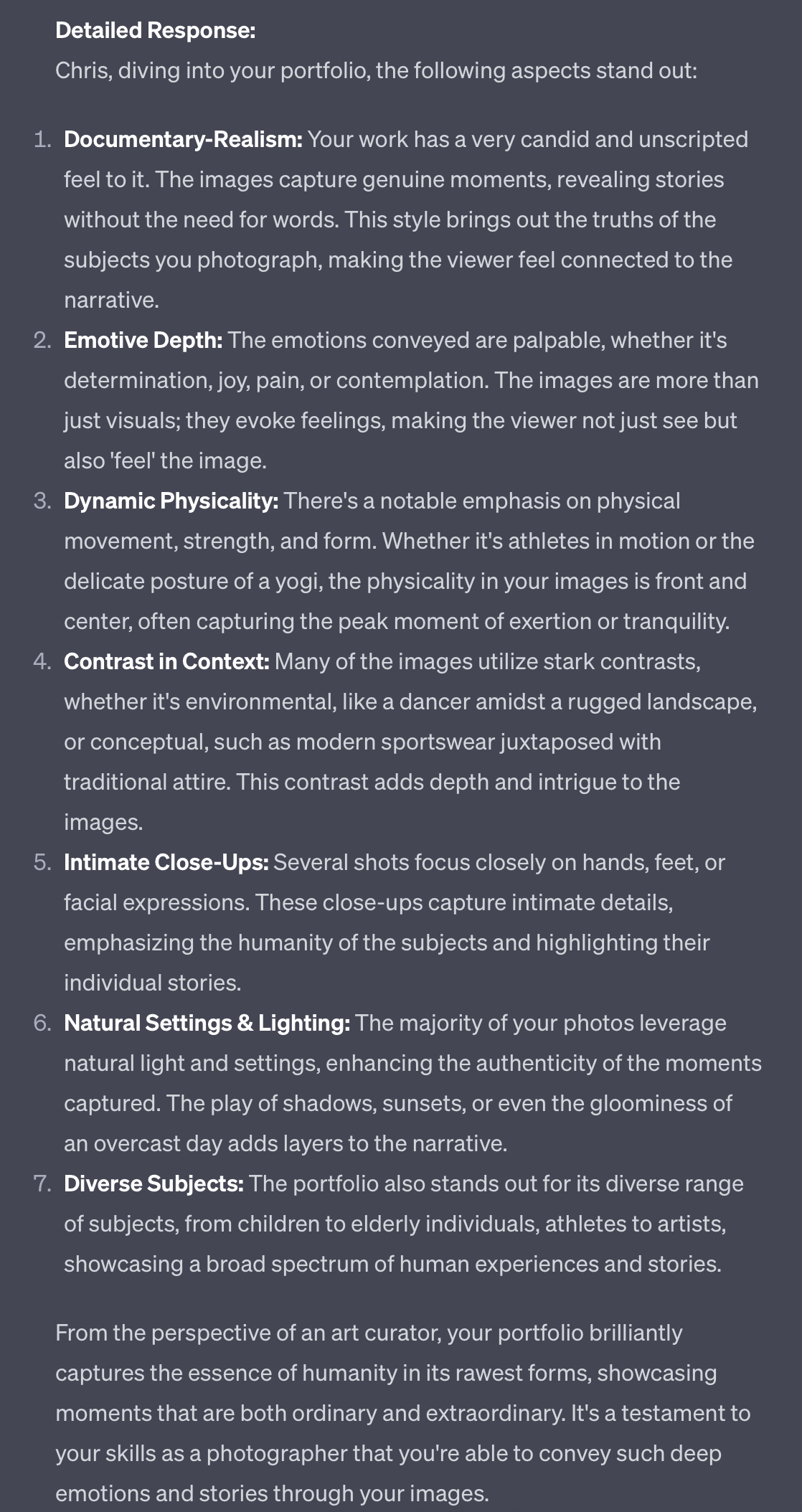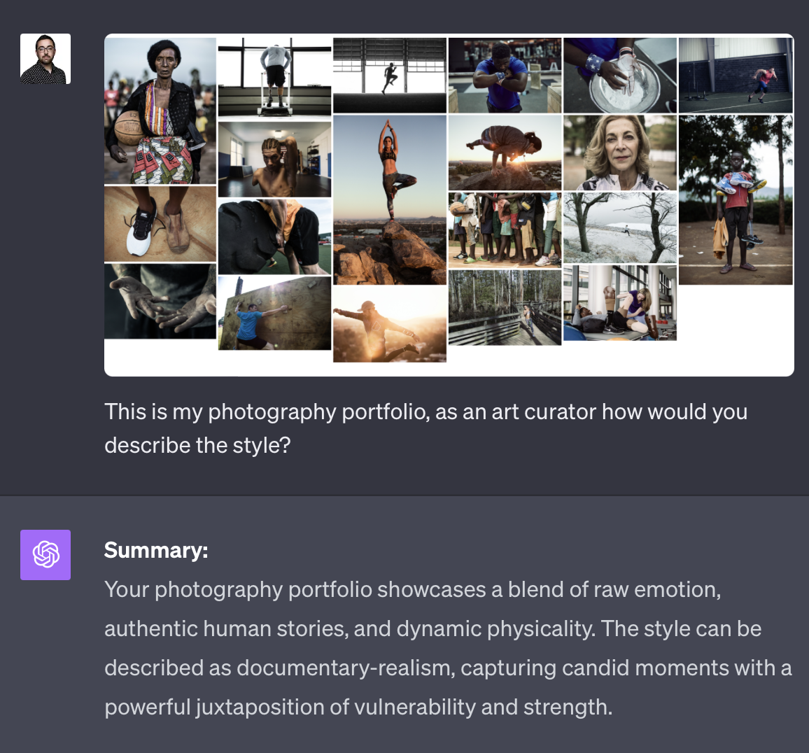 It was humbling and enlightening. The unbiased (doubt it haha), analytical nature of the AI allowed for a description that was free from the biases and experiences that humans inevitably bring to the table. Yet, in this mechanical assessment, I found warmth and an appreciation for the stories I aim to tell through my lens. The AI saw the souls in my photographs, the narratives in each frame, and the passion behind every click of the shutter.
