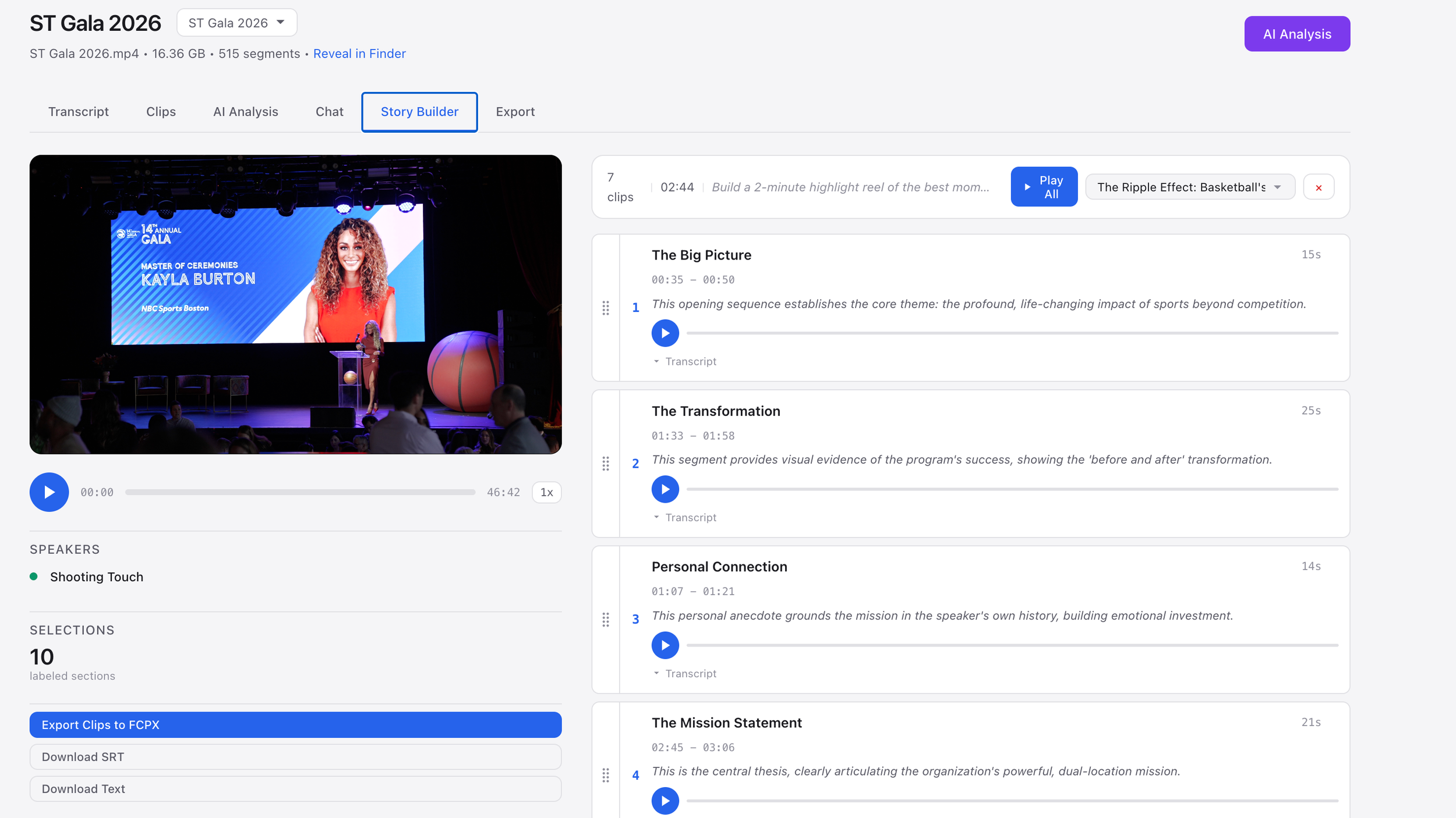 Doza Assist is a free AI editor's assistant for any content with spoken words. It transcribes locally, surfaces story beats and soundbites, builds narrative sequences, and exports straight to Final Cut Pro. No cloud. No subscription. Everything runs on your Mac.